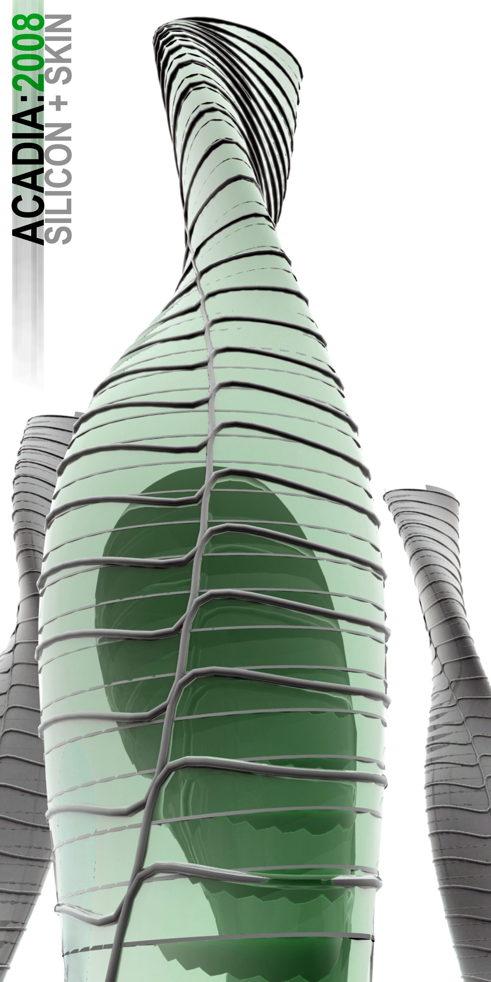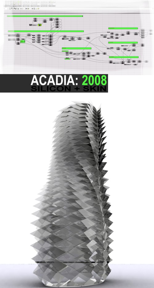 Parametric skyscraper models produced during the 2008 ACADIA Grasshopper workshop, held by Mckneel [Rhinoceros]. During this two day workshop we worked on using the new Rhino plugin to create parametric models and designs. The particular designs were modified to rotate with solar paths and direct natural ventilation into the structure.