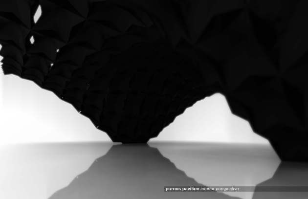 Comprised of a range of 12-tetrahedral modules, each module aggregated onto the surface of the pavillion has the ability to scale itself to one half of its origional size through a system of struts and actuators. At the midpoint of the vertices, the struts collapse and are able to scale towards the centerpoint at which point the modules begin to reveal a porous and stable structure controlling passage of light and access.