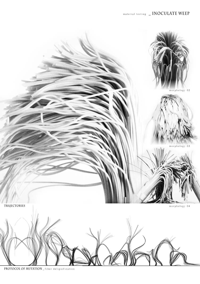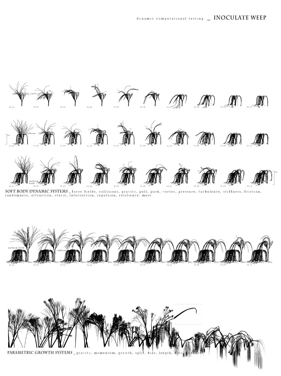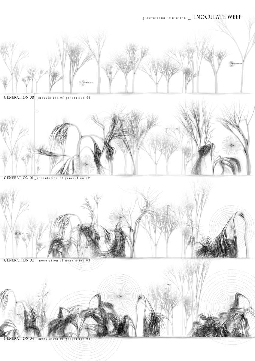 ‘Inoculate weep by Naomi Ocko and Benjamin Riley presents a imaginary forest in which is observed the inoculation of a virus. This agent provokes the death of the trees and thus progress from one to another creating some kind of path which composes a poetic landscape of destruction. We are here at the core of architectural narration and in the process of an architecture trying to express what Francois Roche calls a biotopisation.’ See also this project.