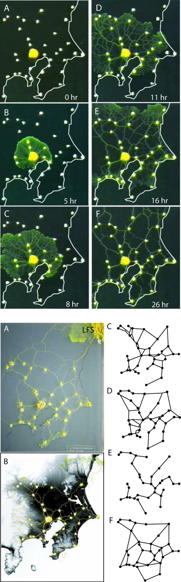 ‘Fig. 1. Network formation in Physarum polycephalum. (A) At t = 0, a small plasmodium of Physarum was placed at the ocation of Tokyo in an experimental arena bounded by the Pacific coastline (white border) and supplemented with additional food sources at each of themajor cities in the region (whitedots). The horizontal width of each panel is 17 cm. (B to F) The plasmodium grew out from the initial food source with a contiguous margin and progressively colonized each of the food sources. Behind the growing margin, the spreading mycelium resolved into a network of tubes interconnecting the food sources.’
