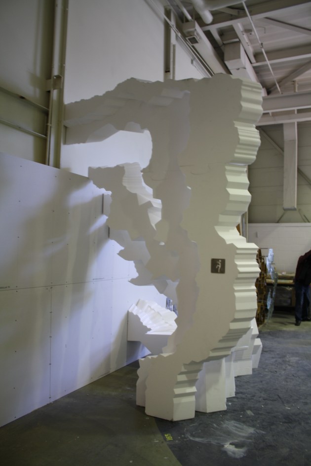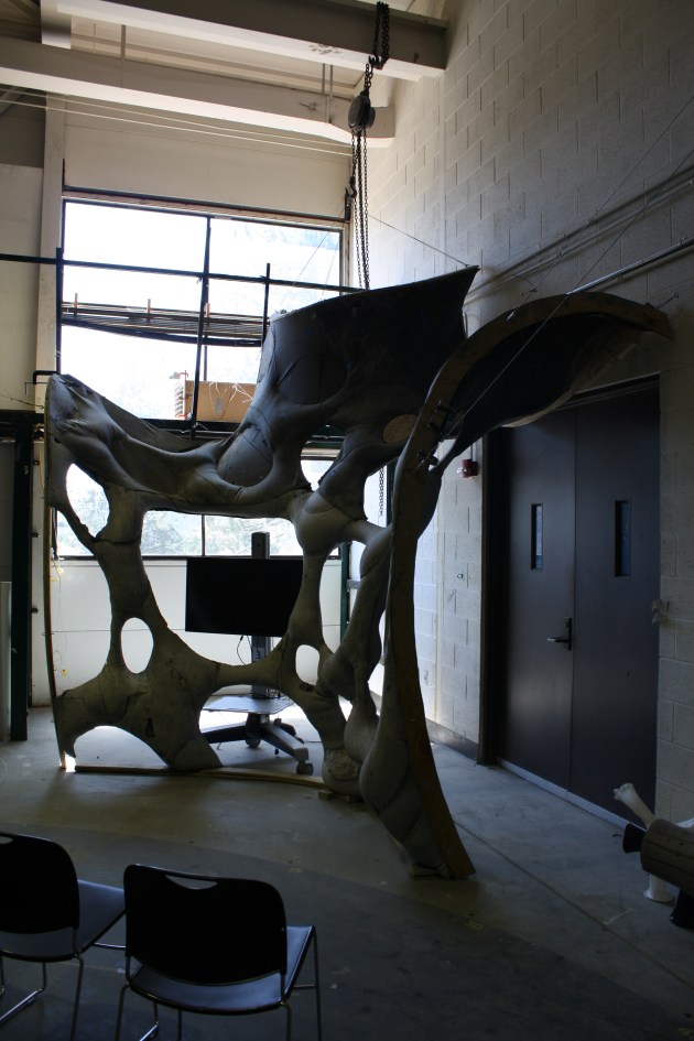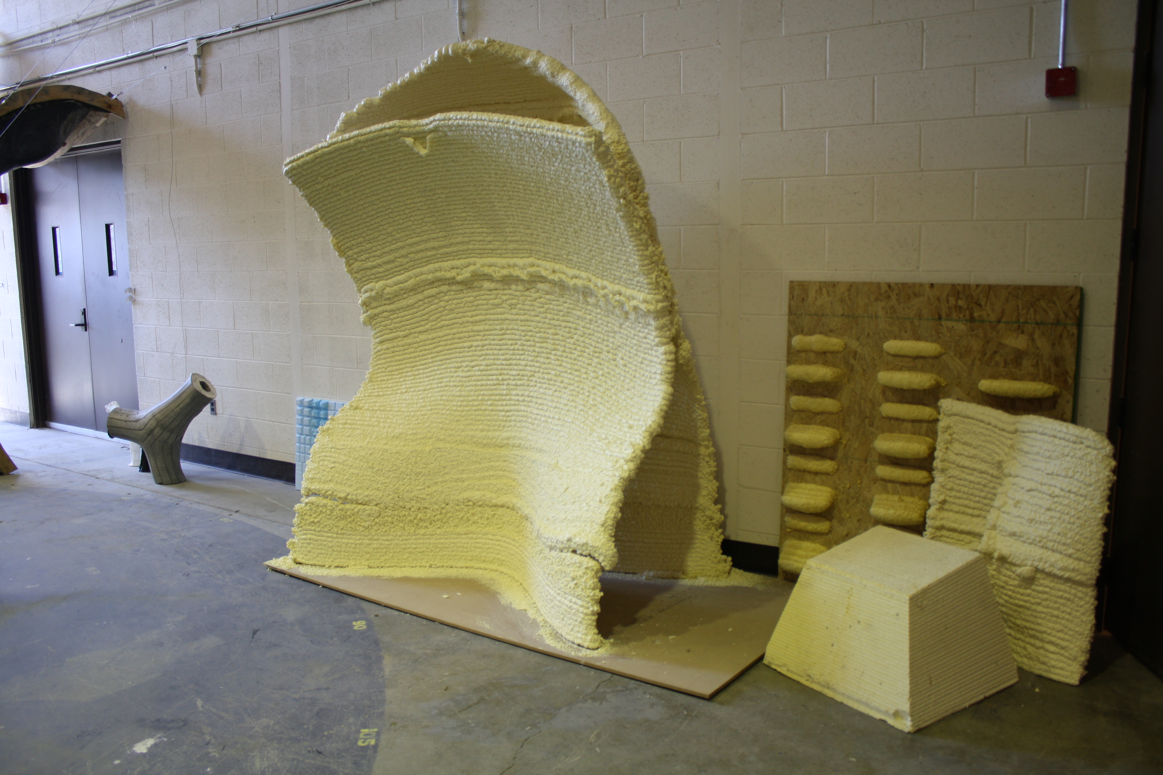 -Images from Winter 2010 Exhibition at University of Michigan robotic fabrication with Wes McGee and David Pigram. Trajectories were chosen from previous research agendas started in 2009 and with the kuka 6-axis robotic arm were advanced and constructed as a 1:1 prototype. Robotic research areas from top to bottom: Polyurethane Foam Rapid Prototyping, Exhibit View, Tensile/Compressive Fabric Structures, Steel Rod Bending, Hot Wire Foam Cutting, Glass Slumping/Water jet Cutting. Projects are still in design research phase of production with ongoing ambitions for the goals of the studio.
