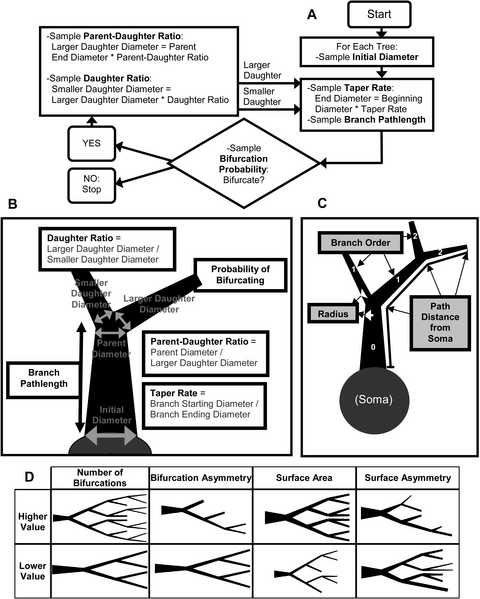 Except for the “unique” case of the initial diameter, the basic parameters extracted from different portions of real trees vary considerably [22]. To obtain distributions faithful to the observed data, basic parameters are thus sampled according to the local value of a “fundamental” determinant. Three variants of this model are based on distinct fundamental determinants (Figure 2A), namely branch radius, path distance from the soma, and branch order (i.e., the number of bifurcations towards the soma). Thus, basic parameters measured from a homogeneous group of real dendritic trees are binned by the corresponding local value of the fundamental determinant. Branch pathlength, daughter ratio, and taper rate are based on the fundamental determinants value at the beginning of a branch, while bifurcation probability and parent-daughter ratio are based on the values at the end of branches.