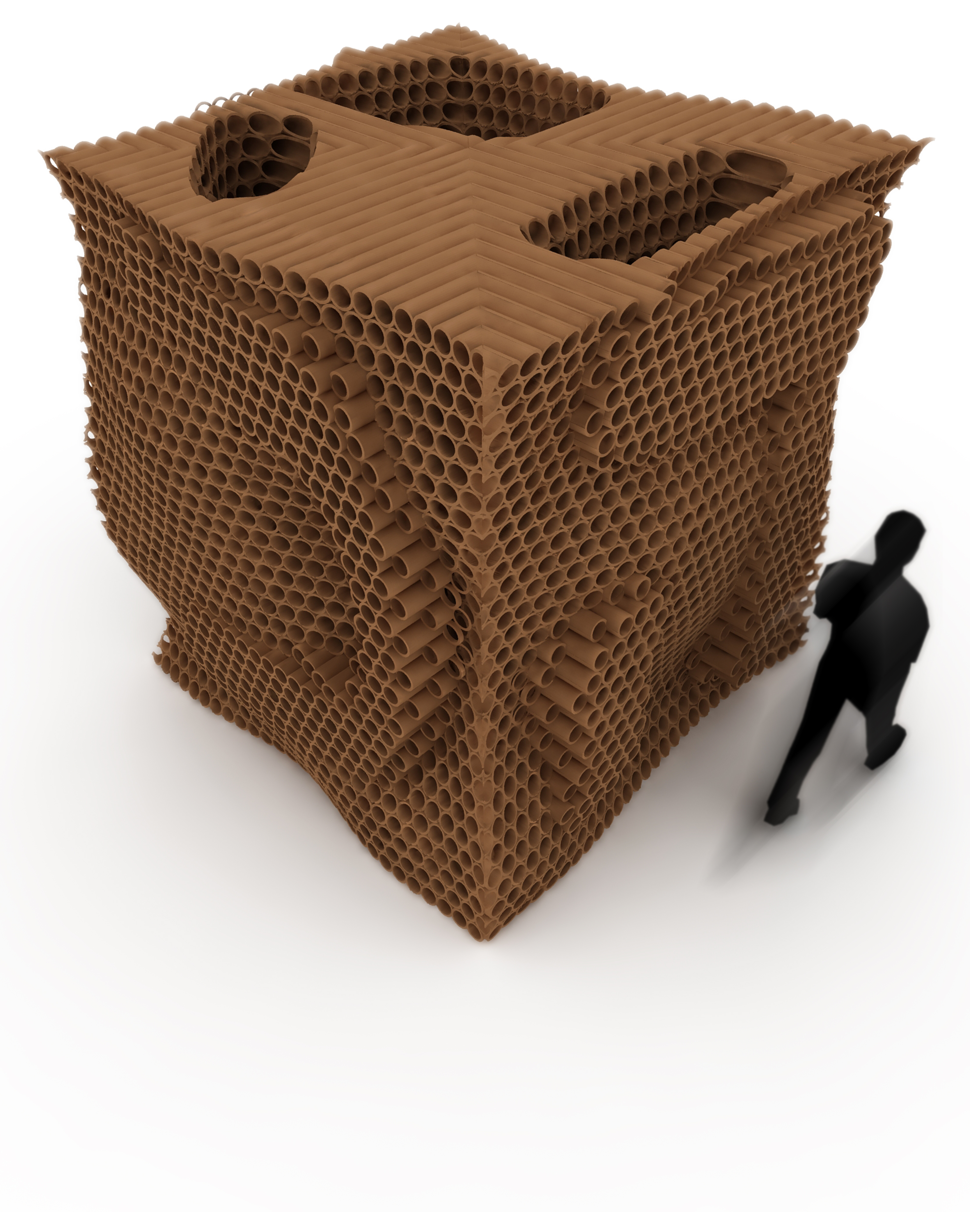 -The above selected images were produced throughout the design process of the Sukkah City competition. The model was constructed parametrically in Rhino Grasshopper to stack cylindrical tubes in an irregular shifting grid, both to account for built-in furniture as well as extruded symbols on exterior walls. The tubes are exported from the Grasshopper definition to an Excel spreadsheet where length of tube, midpoint, and angles of cuts are documented. The initial materiality of the project was chosen for its reuse, this came in the form of acid-free cardboard tubes leftover from newspaper printing plants (also known as “end-rolls”). Below are the notes which led the trajectory for the project: