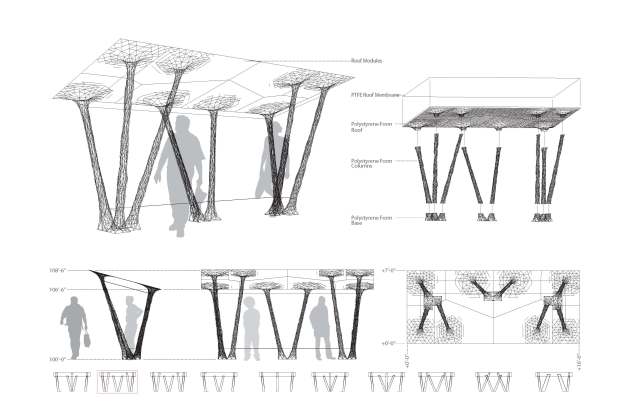 -Third iteration in the design of the carbon fiber bus shelter system. The polystyrene form has been broken down into modular components for more efficient transportation to and installation on the site. The components will be attached on site, where a PTFE-Kevlar reinforced woven fabric will be added to the roof and walls. 1″ carbon fiber biaxial tape was used for ultimate tensile strength testing; with 3 1-inch strips withstanding a total of 2100# UTS. Following further testing and finalization of the design, fabricating the foam forms and applying carbon fiber will be the next steps in the process.