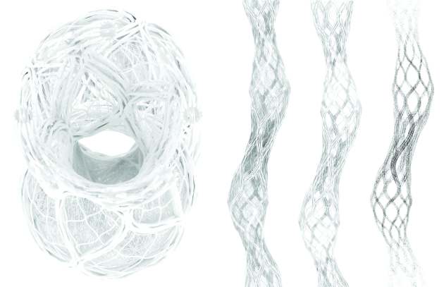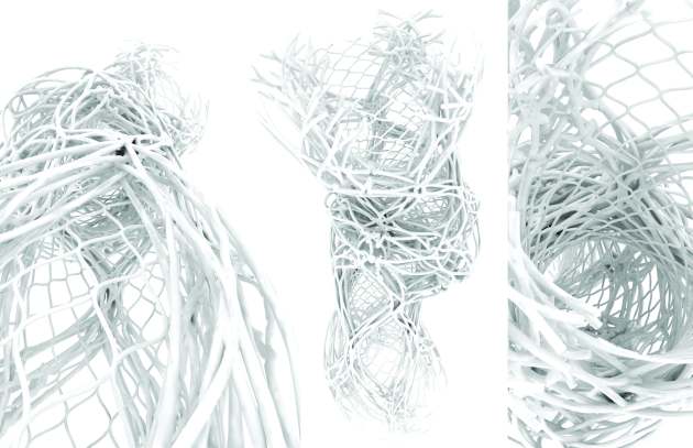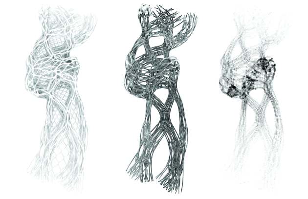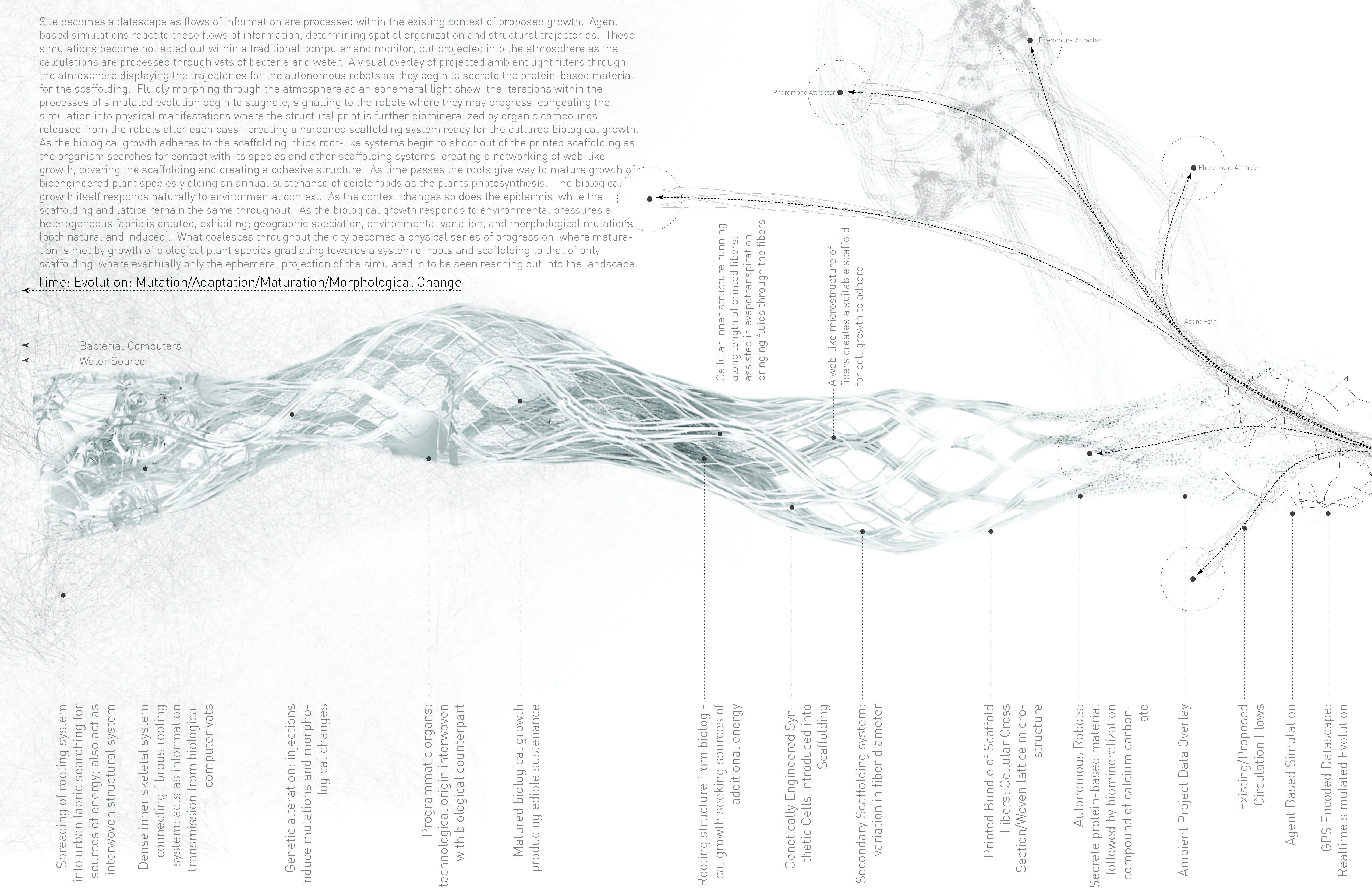 Site becomes a datascape as flows of information are processed within the existing context of proposed growth. Agent based simulations react to these flows of information, determining spatial organization and structural trajectories. These simulations become not acted out within a traditional computer and monitor, but projected into the atmosphere as the calculations are processed through vats of bacteria and water. A visual overlay of projected ambient light filters through the atmosphere displaying the trajectories for the autonomous robots as they begin to secrete the protein-based material for the scaffolding. Fluidly morphing through the atmosphere as an ephemeral light show, the iterations within the processes of simulated evolution begin to stagnate, signalling to the robots where they may progress, congealing the simulation into physical manifestations where the structural print is further biomineralized by organic compounds released from the robots after each pass–creating a hardened scaffolding system ready for the cultured biological growth. As the biological growth adheres to the scaffolding, thick root-like systems begin to shoot out of the printed scaffolding as the organism searches for contact with its species and other scaffolding systems, creating a networking of web-like growth, covering the scaffolding and creating a cohesive structure. As time passes the roots give way to mature growth of bioengineered plant species yielding an annual sustenance of edible foods as the plants photosynthesis. The biological growth itself responds naturally to environmental context. As the context changes so does the epidermis, while the scaffolding and lattice remain the same throughout. As the biological growth responds to environmental pressures a heterogeneous fabric is created, exhibiting; geographic speciation, environmental variation, and morphological mutations (both natural and induced). What coalesces throughout the city becomes a physical series of progression, where maturation is met by growth of biological plant species gradiating towards a system of roots and scaffolding to that of only scaffolding, where eventually only the ephemeral projection of the simulated is to be seen reaching out into the landscape.”
