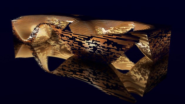 Comprised of horizontal serial sections of wood, the AA_02 : Planks + Pixels installation transforms a once socially-deprived voluminous-void into a socially activated replacement. Vacant spaces becomes digitally congealed, eroded and guided over time by a stream of excited energy particulates eroding to expose a striated mass enveloping areas for intimate social interactions to occur. The structure hosts an integrated shelving system where grooves hold the displays of past competition entrants and winners–once vacant space becomes enriched through the cultural narrative of the Anonymous. Cave-like niches within the structure are carved-away to reveal areas for a more informal social interaction whilst allowing for visual connectivity to the main circulatory path below. Central to the affect and effect of the design is the dispersion of light as it filters through a stochastic pattern of pixelated surfaces into the habitable spaces within.